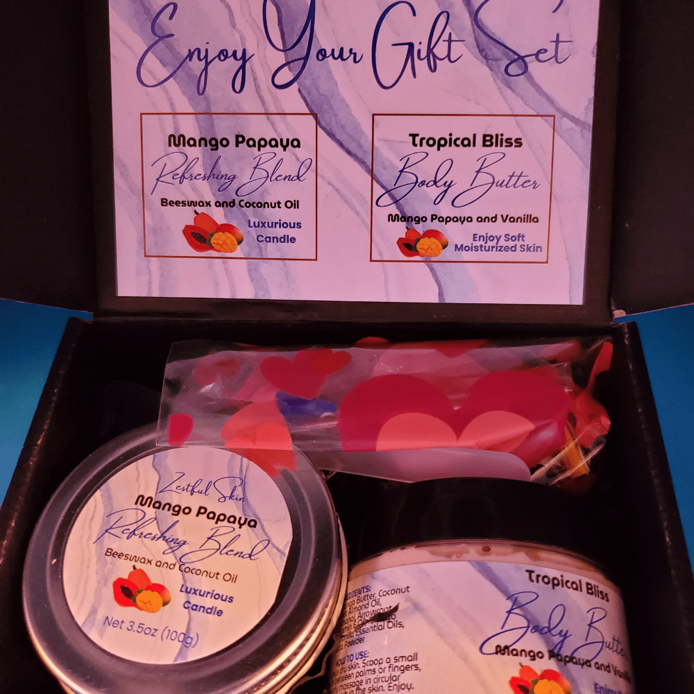 Elevate your everyday routine with the indulgent luxury of Zestful Skin’s Mango Papaya Body Butter & Candle Gift Set.